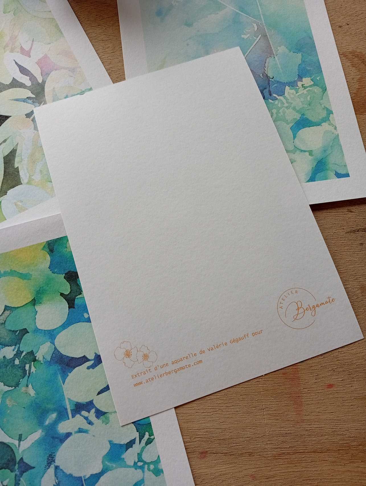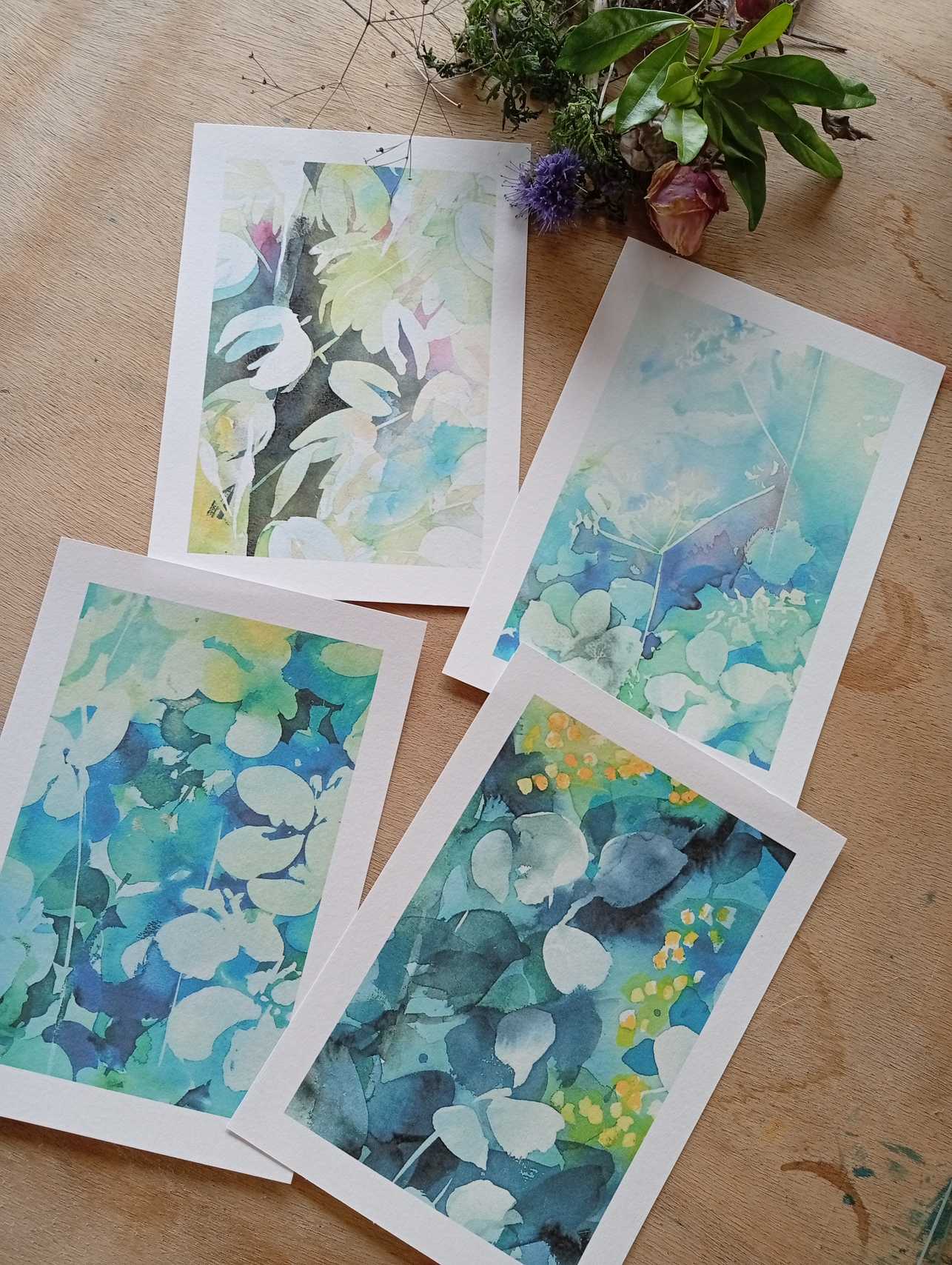 Lot de 4 cartes simples dans les tons bleus, format A5 (14.8 x 21 cm).