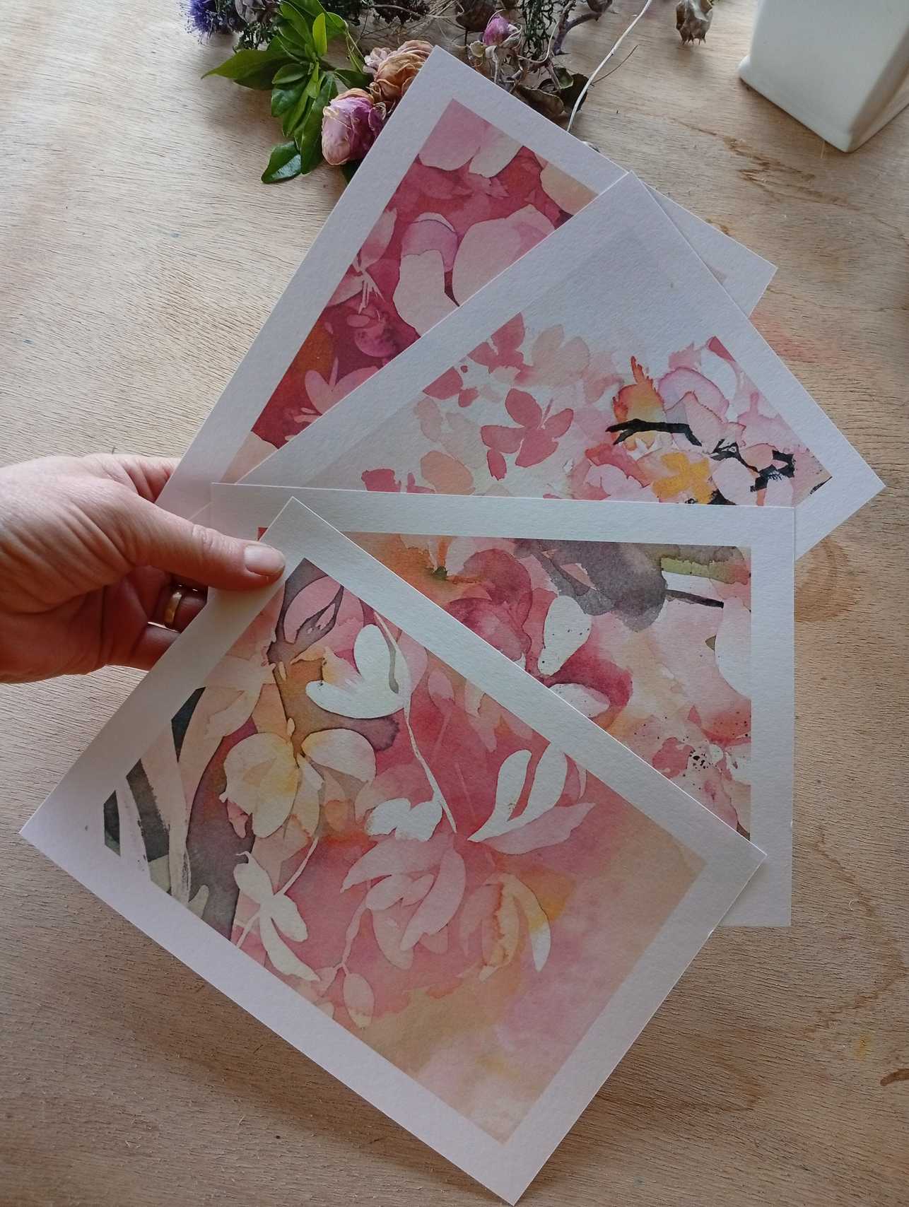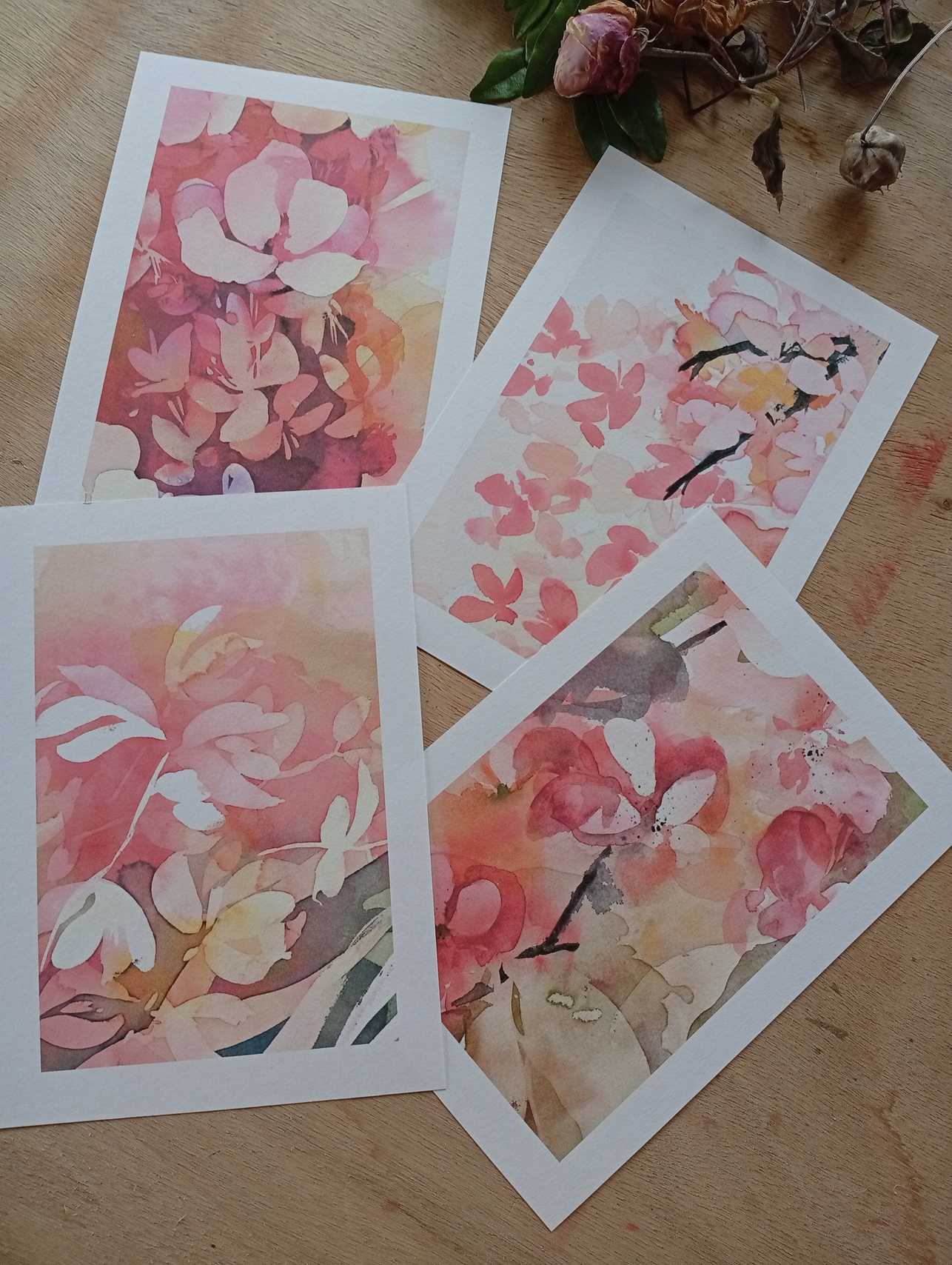 Lot de 4 cartes dans les tons roses, dont les sujets sont extraits de mes aquarelles, format A5.