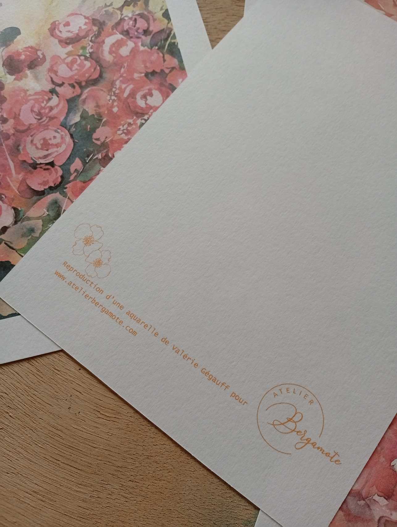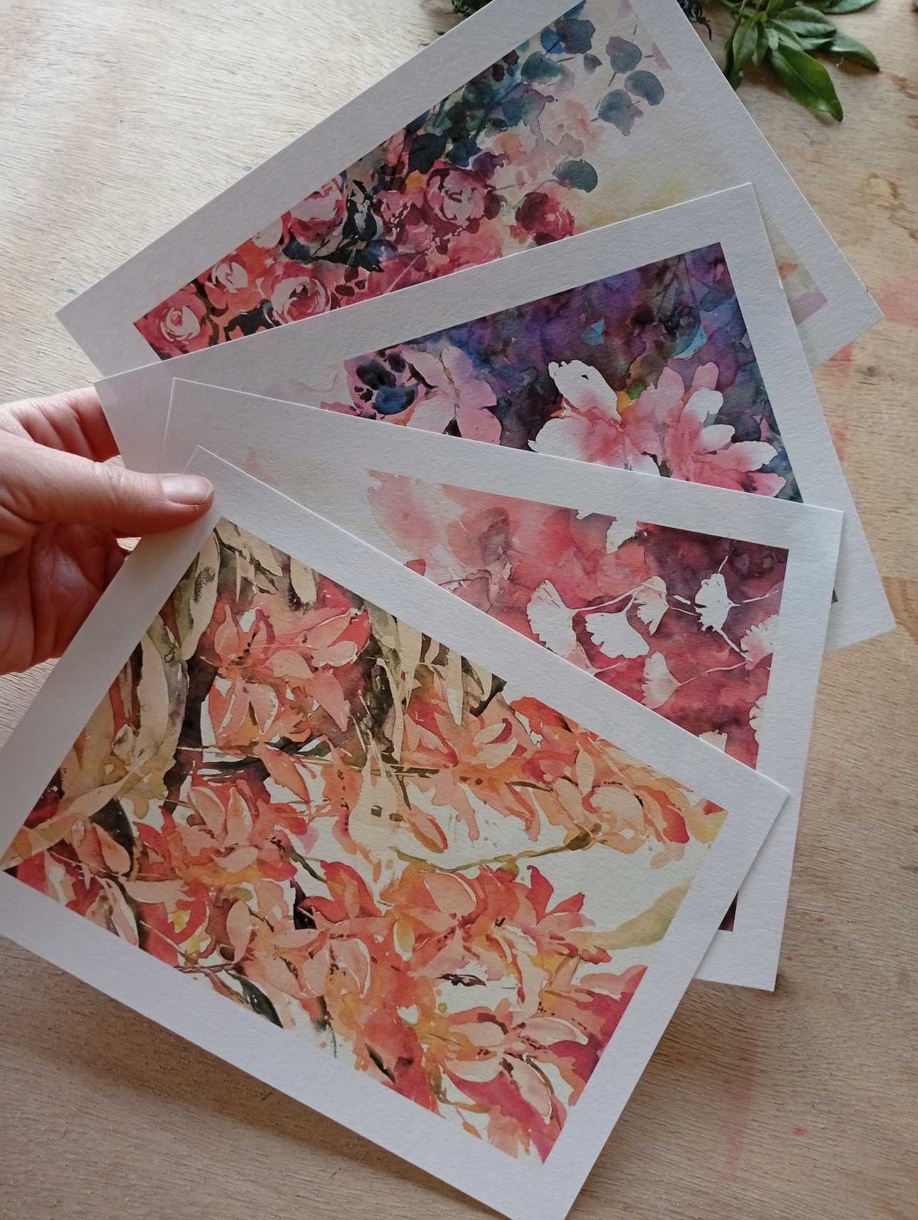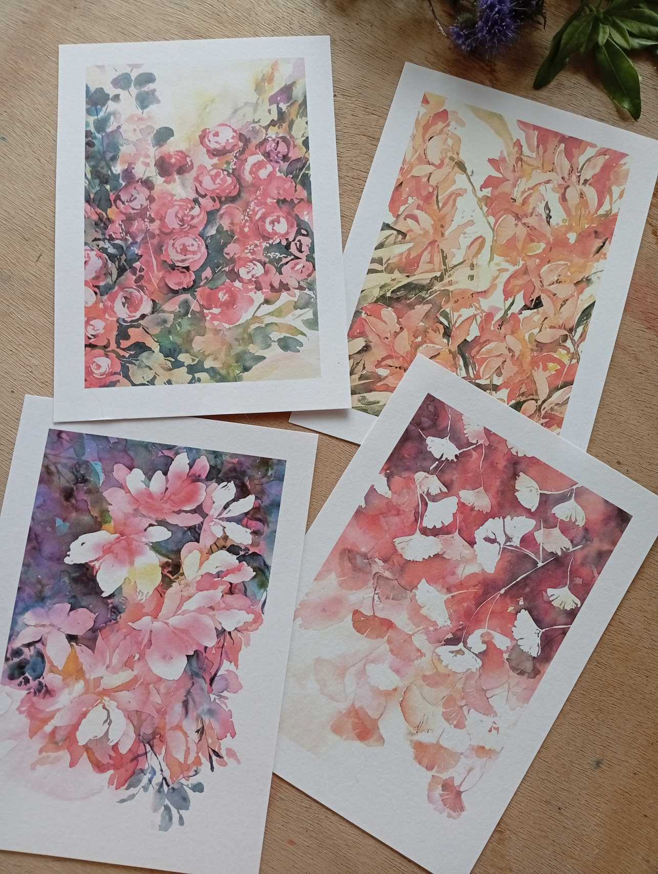 Lot de 4 cartes simples de reproductions d’aquarelles entières, format A5 (14.8 x 21 cm).