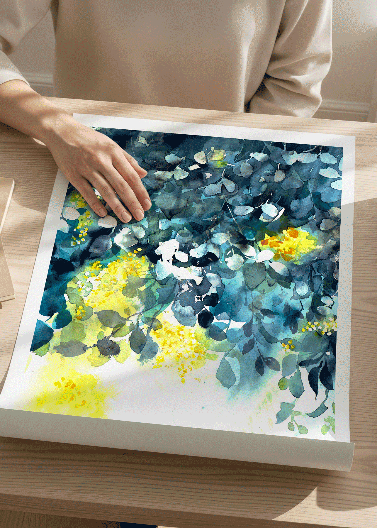 Imprimé sur du papier mat « Fine Art » 200 g/m² blanc naturel. L’impression haute qualité (aussi appelée Giclée Print) et le fini mat mettent en valeur les couleurs et les dégradés de l’aquarelle originale.